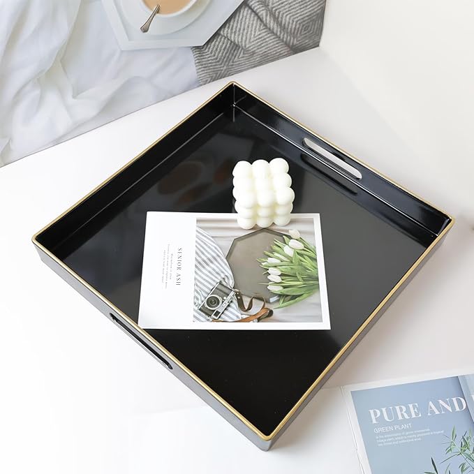 Spsyrine Black Decorative Tray for Living Room, Square Modern Plastic Coffee Serving Table Tray for Ottoman Bathroom Kitchen, 13"*13"