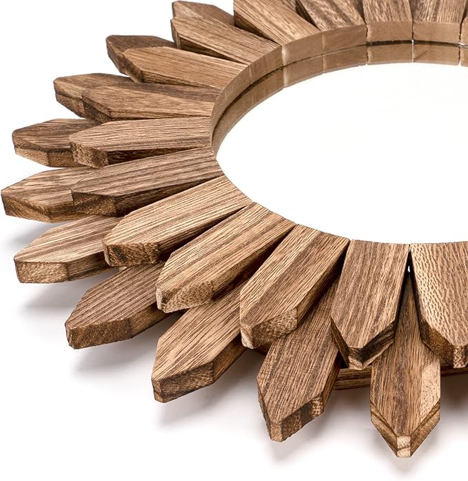 - Boho Wall Decor Mirror: The design of wood sunburst base on the element of boho style, it will be a nice touch and goes well with your others boho decor style; decent decorative piece with perfect size for wall mounted or lean on wall at desk, perfect for your bedroom, living room, bathroom, kitchen and more