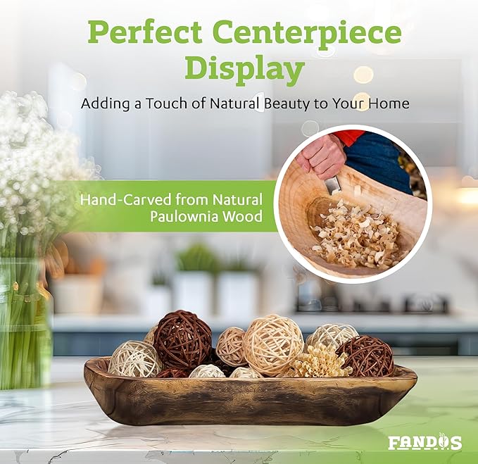 - QUALITY, STYLE & DURABILITY: Bring rustic charm to your home with this decorative wooden bowl made from 100% solid Paulownia. Strong, stylish, and built to last—perfect as a long dough bowl for centerpieces or wooden bowls for decor. Not intended for food or liquids. Wipe down with damp cloth or wood-safe polish.