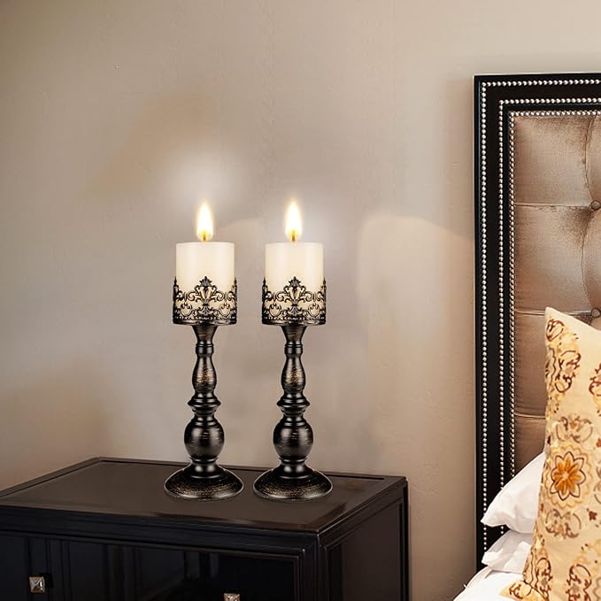 - INCLUDING: 2x distressed black candle holders(Candles not included). Candle holders height:11inch (28cm) bottom diameter: 4.1inch (10.4cm).All candle plate diameter are 3.15''(8cm). Check if your candle size is suitable before purchasing. Additionally, it also includes an installation manual, and the candle holders require simple self-assembly.