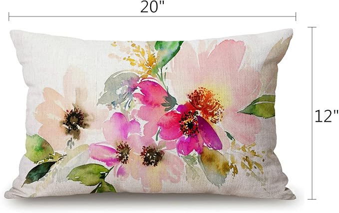 12x20 Inches Pillow Covers Rustic Farmhouse Decor Beautiful Watercolor Flower Pillowcases Cotton Linen Pink Floral Throw Pillow Case Cushion Cover for Sofa Couch Bedroom