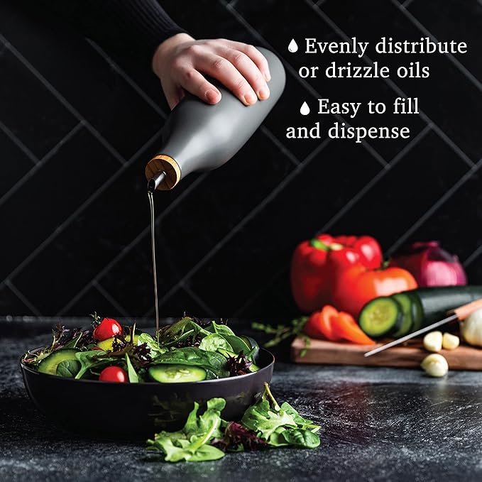 - MODERN DESIGN : The modern design of this bottle includes a matte glaze and a neutral wood cap and stainless steel cruet spout, making it a stylish and functional addition to any kitchen counter.
