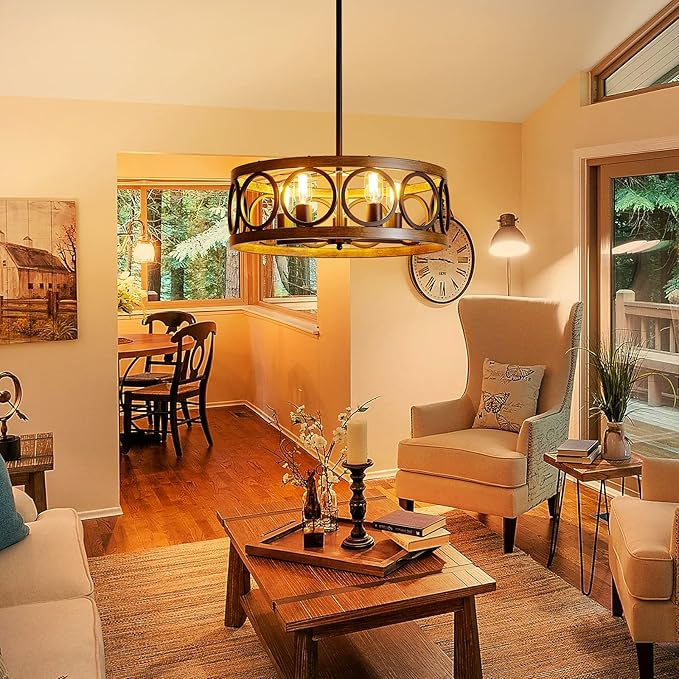 - [PERFECTLY VERSATILE] This farmhouse chandelier has a unique open drum frame with an antique wood grain and brushed nickel finish. The chandelier is made of metal, not plastic. Beautiful and durable. It will perfectly complement decorative styles from modern to farmhouse. Brighten up your home kitchen, dining room, or farmhouse style place.