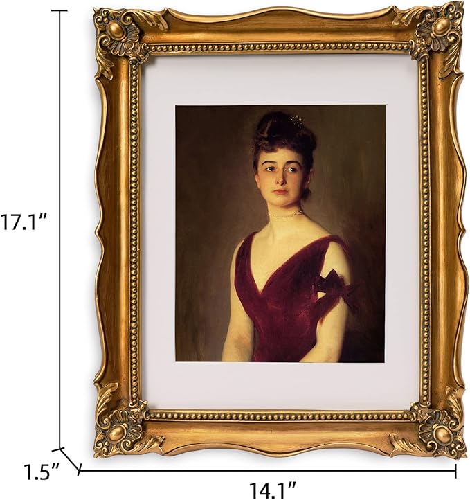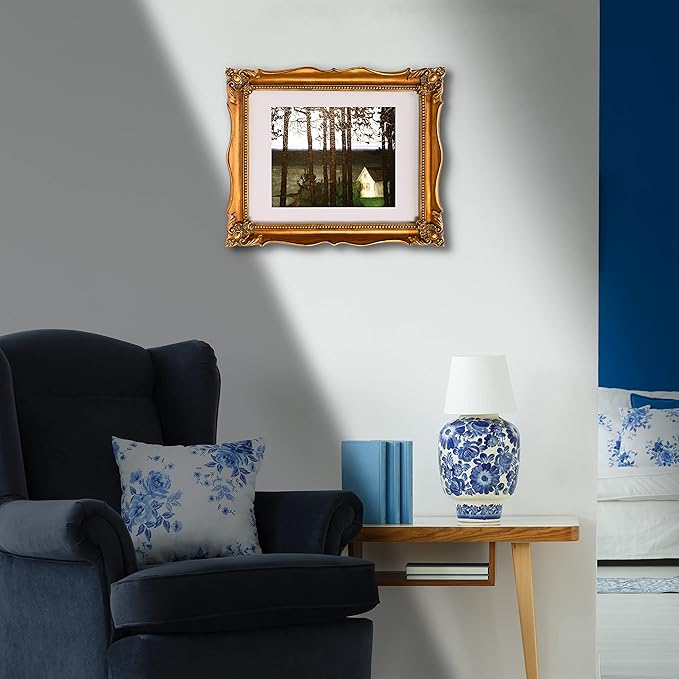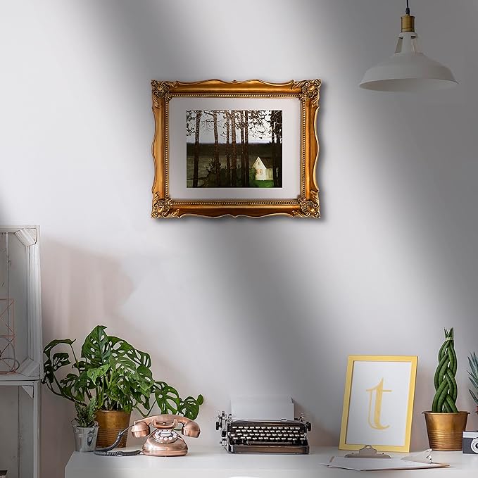 - Easy to Display: This 11x14 ornate gold frame comes with a removable white mat and a decor picture. The white mat can be entirely removed for 11x14 paintings or keep it for 8x10 paintings, perfect to display any photos or paintings. The back of frame is a soft velvet back plate equipped with two-way serrated hook, which can hang on the wall in vertically or horizontally.