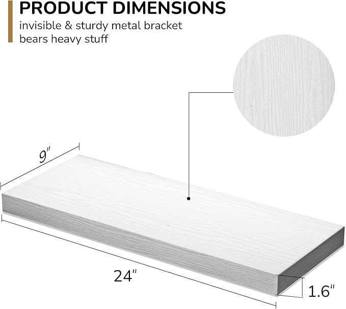 - Extra Deeper & Thicker - Each board measures 24"W x 9"D x 1.6"H. Extra deeper and thicker design in order to bring maximizes storage space and weight capacity, even hold up to 50 lb each. This floating shelf taking up zero square feet, reduces clutter and highlights décor in compact spaces.