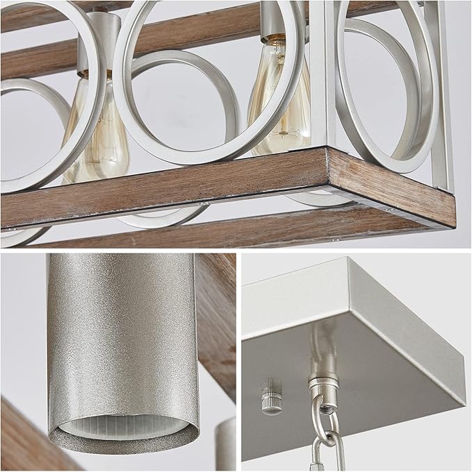 XINGQI Farmhouse Dining Room Chandeliers, Rectangle Vintage Hanging Lighting Fixtures, 4-Light Kitchen Island Lighting, Rustic Metal Chandelier Pendant Light, Antique Wood Grain XY082