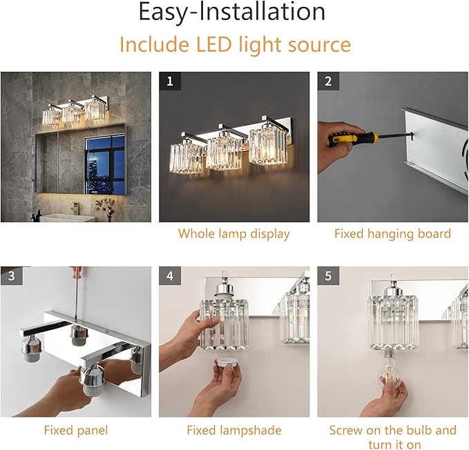 - [Easy Installation] This is designed for American Standard junction boxes and does not require complicated installation procedures. All required parts are included in the package and extra replacement crystal strips are available. Note: For your safety, please install the vanity light under the guidance of an electrician.