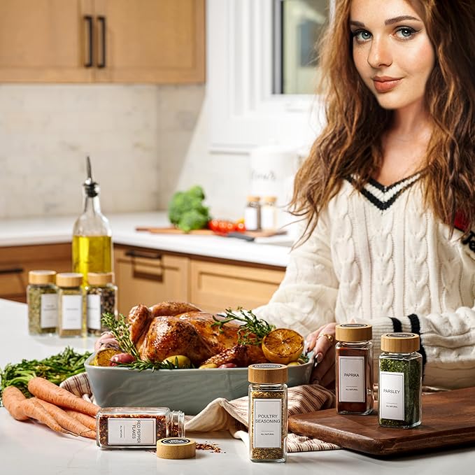 Set of 24 Glass Spice Jars with Various Labels, Bamboo Shaker Lids & Funnel, Kitchen Storage Jars with Airtight Lid, Spices & Seasonings Sets Organizer, Spice Containers, Glass Jar Food Canister