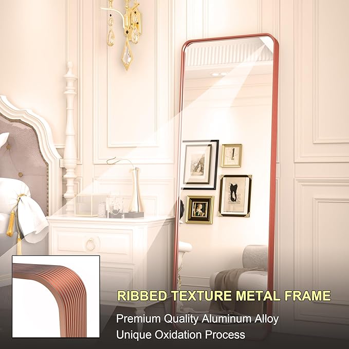 65 x 22 Inch Full Length Floor Mirror, Rose Gold Wall Mounted Full Body Mirror with Aluminum Alloy Brushed Ribbed Texture Frame, Tall Floor Mirror for Living Room/Entryway/Bedroom