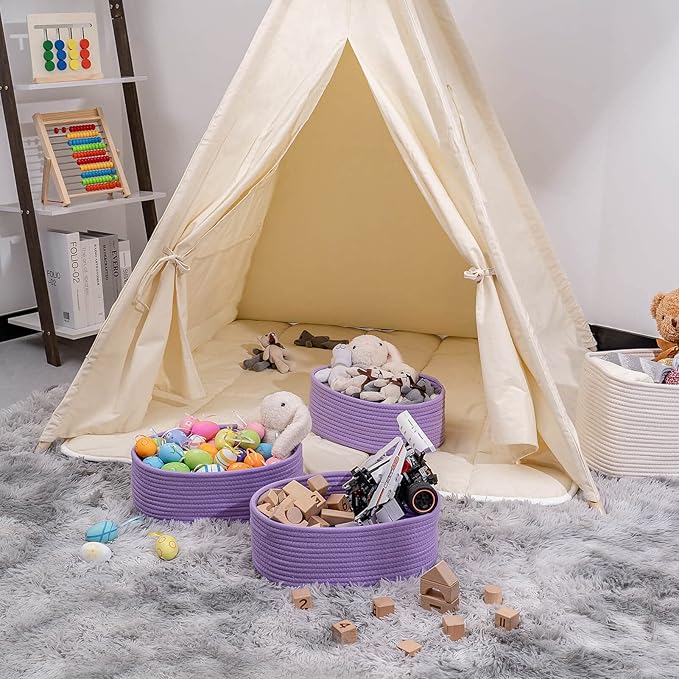 Baskets Bins for Shelf Storage Organizing/Cute Basket to Store and Organize Household Items/Woven Rope Basket for Living Room, Bedroom,Playroom,3 Packs Purple Basket