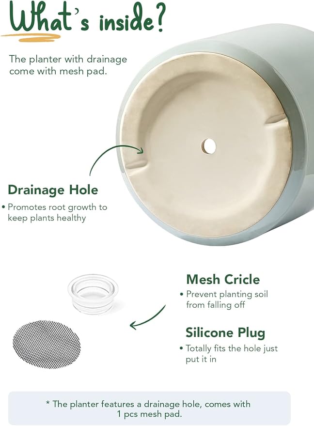 - Silicon Plug & Drainage Hole & Net Included: To drain or not to drain, it's all up to you; Roots love moisture but are afraid of excessive water; Use a silicon plug to prevent water leakage, or cover the drainage hole with a mesh pad to prevent soil loss, offering good ventilation for plants to breathe freely (Plant is Not Included)