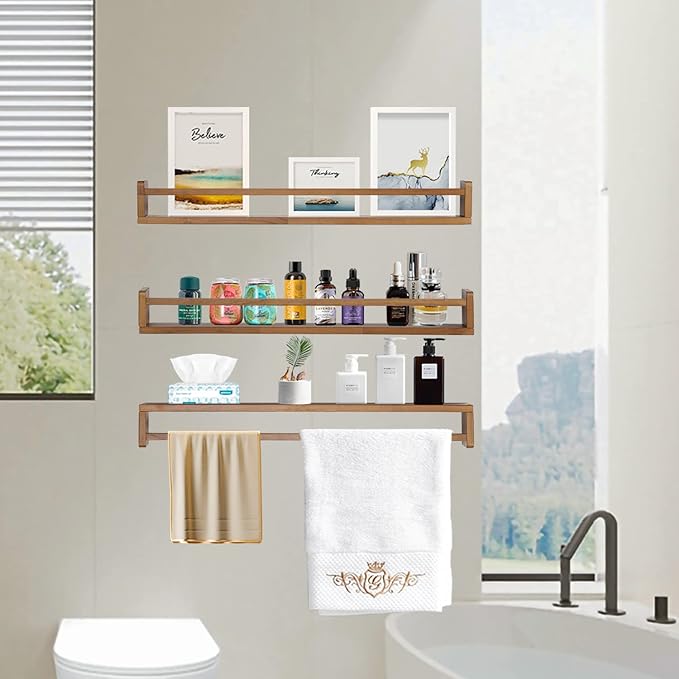 - Multifunctional Storage Wooden Shelf: This floating shelf can be used as a decorative item to decorate walls or store items. Perfect for organization and decoration, it can hold many items such as: aromatherapy, toilet paper, bath products, toiletries, spices, cans, books, photo albums, trophies, honors, crafts, etc.