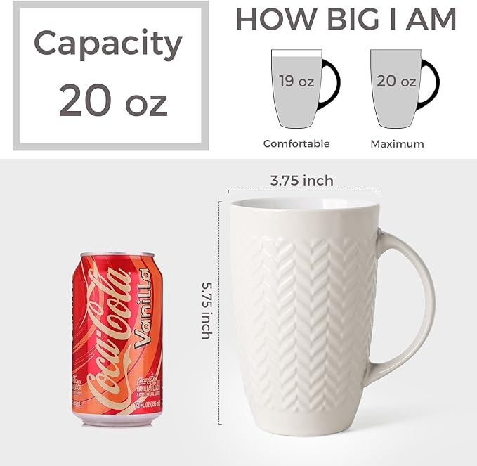 - 20OZ & VERSATILE : Big size for home and office daily use, even if you don't want to fill them, a normal cup of beverage is easier to handle without concern of spilling. Large capacity not only meet your coffee need, But also a great choice for tea, soup,beer, cocoa and more.