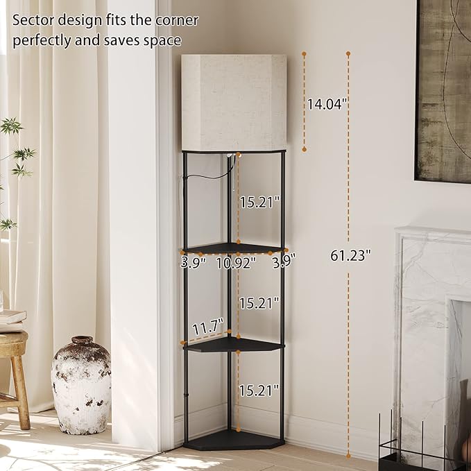 - 【Multi-function】 The corner floor lamps for living room adopts the design of top lamp + 3-layer fan-shaped shelf. It can not only be used as a floor lamp, but also can be used as a shelf or a display cabinet. You can also place some ornaments, photo albums, plants, books on it used as decorations while enjoying the light it brings.