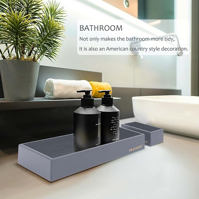 "Coordinated dispensers, toothbrush holders, trays, and storage accents that declutter the counter...