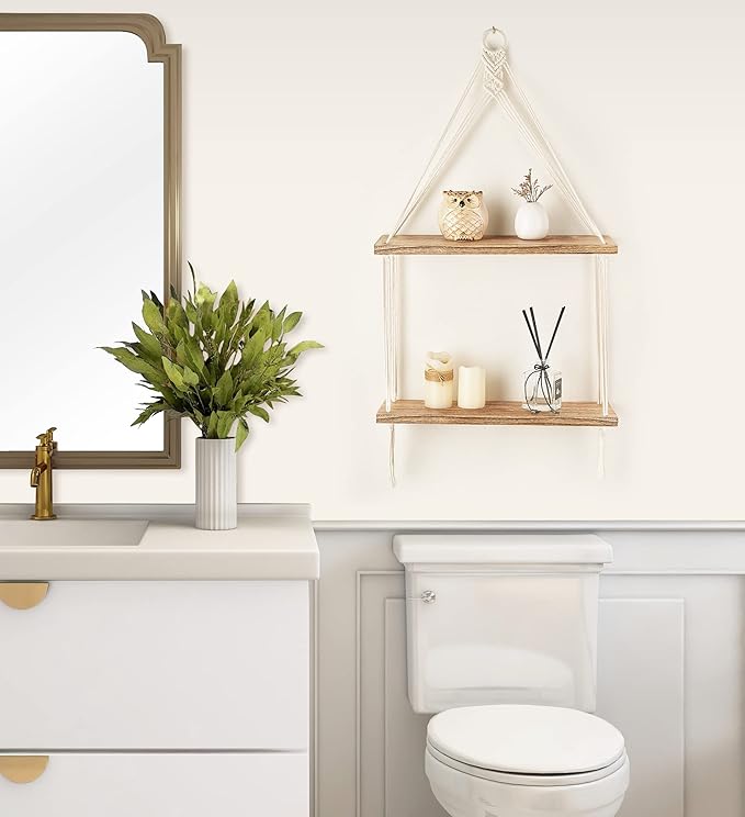 Mkono Macrame Hanging Shelf Boho Wall Decor 2 Tier Handmade Cotton Rope Rustic Wood Floating Shelves Display Photos Plants Hanging Storage Shelving for Living Room Nursery Bathroom Bedroom