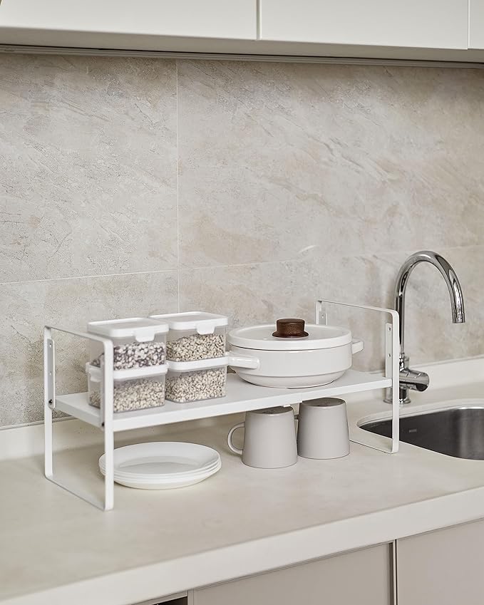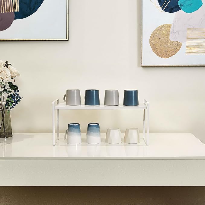 Nxconsu Cabinet Shelf Expandable Height Adjustable Organizer Riser for Kitchen Cabinet Pantry Cupboard Under Sink Countertop Organization Storage Space Saver Stackable Heavy Duty Metal White