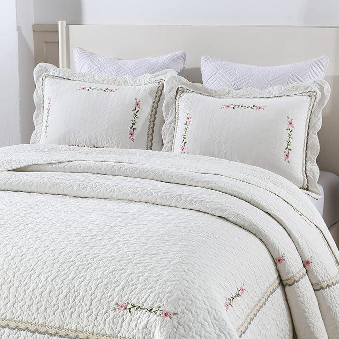 MarCielo 3-Piece 100% Cotton Oversized Bedspread Lightweight Quilt Coverlet Embroidery Farmhouse Bedding Set (Sakura White, Oversized Queen (100"x106"))