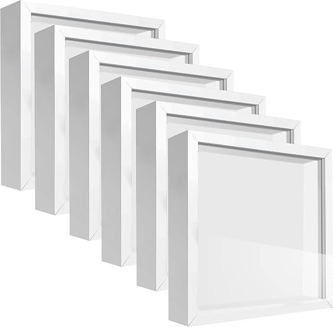 - Size: The white shadow box frame 5"x5" with an exterior depth of 1.8" and internal dimension of 4.7"x4.7" with an interior depth of 1.2". The packaging includes 6 packs 5x5 square shadow boxes .