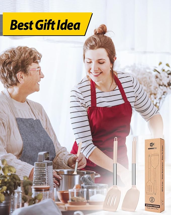 Pack of 2 Silicone Solid Turner, Non Stick Slotted Kitchen Spatulas, High Heat Resistant BPA Free Cooking Utensils, Ideal Cookware for Fish, Eggs, Pancakes(Stainless Steel Khaki)