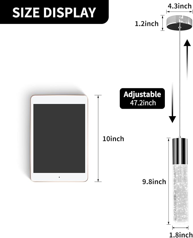 - 【Size and dimmable】: Kitchen island pendant light cylindrical body diameter: 4.6 cm, height: 24.9 cm. The height can be adjusted from 24.93 cm to 119.9 cm. Pendant light fixture with ETL certified dimming driver, the light brightness can be between 10%-100%, but needs to be used with a dimmer.