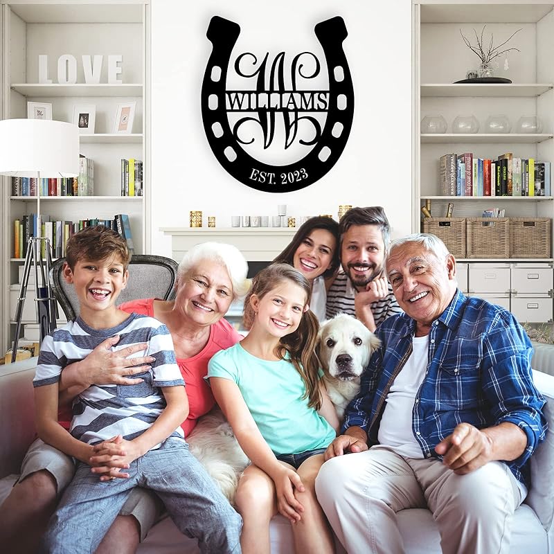 Personalized Horseshoe Metal Sign with Initial and Family Name, Custom Monogram Horseshoe Metal Sign, Horseshoe Metal Wall Art Last Name Sign Equestrian Horse Lover Gift Horseshoe Living Room Decor