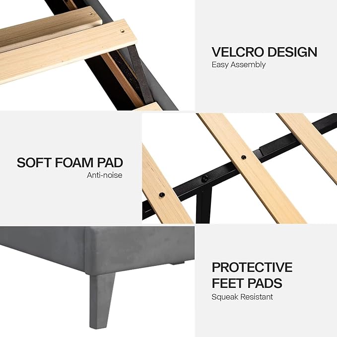 - NO BOX SPRING REQUIRED & NICE SERVICE: The mattress can be placed directly on the wooded slats of the grey bed frame, no need to buy additional box springs, you can save more money and time! DOGIBIXO bed frame warranty: ① Replace any missing or damaged parts. ② Reasonable compensation for quality and transportation problems. ③ 24-hour after-sales customer service is online to solve your problems and bring you a good shopping experience.