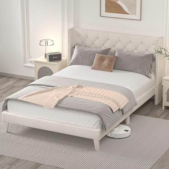 - ELEGANT BED FRAME WITH SMART LED LIGHTS: Nailhead trim wingback headboard is paired with velvet fabric for a sleek, skin-friendly contemporary upholstered bed frame. Elegant geometric shapes paired with simple beige are easy to integrate into your new housewarming home! The colorful light bed frame lights up your room at night, so that you and your family don't have to endure the dark room anymore.