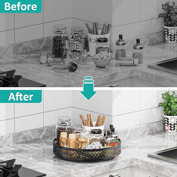 - Large Space Organizer:This lazy susan organizer measures 11 inch,providing more storage capacity in your deep cabinets,upper shelves and cluttered corner countertop , Making the most use of the limited space in your home to keep things neat and organized.