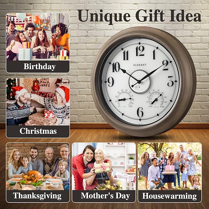 - 【IP65 Weatherproof Outdoor Night Light Wall Clock 】 This Oversized hand brushed gray oak 18 Inch large outdoor clock is UV resistant,sealed with front and back rubberized gasket for protection from water and other outdoor elements.An elegant timepiece for your outdoor garden,pool, patio or backyard,porch,modern farmhouse living room,dinning room,bathroom,kitchen,fireplace,entryway,home office