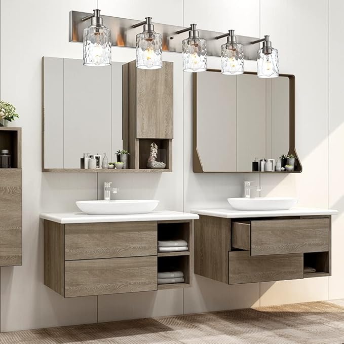 - Classic Chic Design :Farmhouse inspired, the 3-Lights brushed nickel bathroom vanity light fixtures is transitional home decor at its best. The simple yet elegant metal finish with hammered glass shades have classic and timeless look and lends itself to placement in a bathroom, entryway or dining room, bringing a classically minimal vibe to the space.