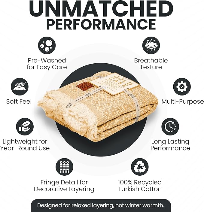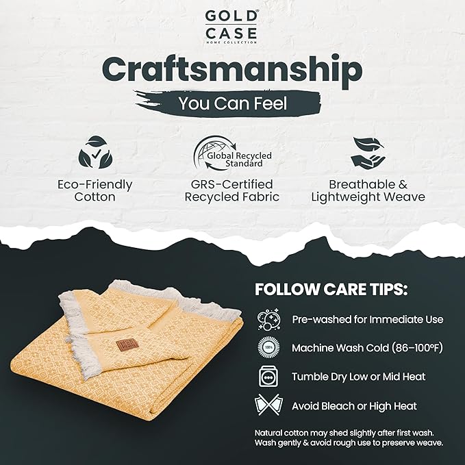 Gold Case Throw Blanket for Couch – 100% Recycled Turkish Cotton Blankets & Throws – Elegant Decorative Throw Blankets for Living Room Sofa – Woven Throws for Couch – Retro Mustard – 50x60