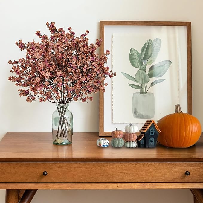 Sggvecsy 15 Pcs Babys Breath Artificial Flowers Gypsophila Bouquets Bulk Real Touch Fake Silk Flowers for Home DIY Floral Arrangement Table Centerpiece Fall Autumn Decoration (Orange Brown)