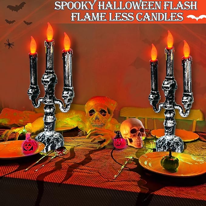 TURNMEON 2 PCS Skull Halloween Candles Lamp,Halloween Decorations Indoor 3-Candles Candelabra LED Lights Battery Operated Candles Holder, Halloween Decor for Home Table Party Room Scary Haunted House