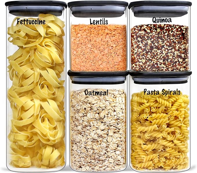 - ✅ NEW STYLISH BLACK LID SQUARE SHAPE: Looking for black and white, cool and stylish home deco? These Urban Green glass food storage canister sets with black lids are perfect for contemporary pantry design. We carefully selected 5 different sizes from 6oz to 100oz that can store any dry food, such as pasta, beans, nuts, cookies, spice or flour. Try our black lids glass jars for a new modern pantry organization.