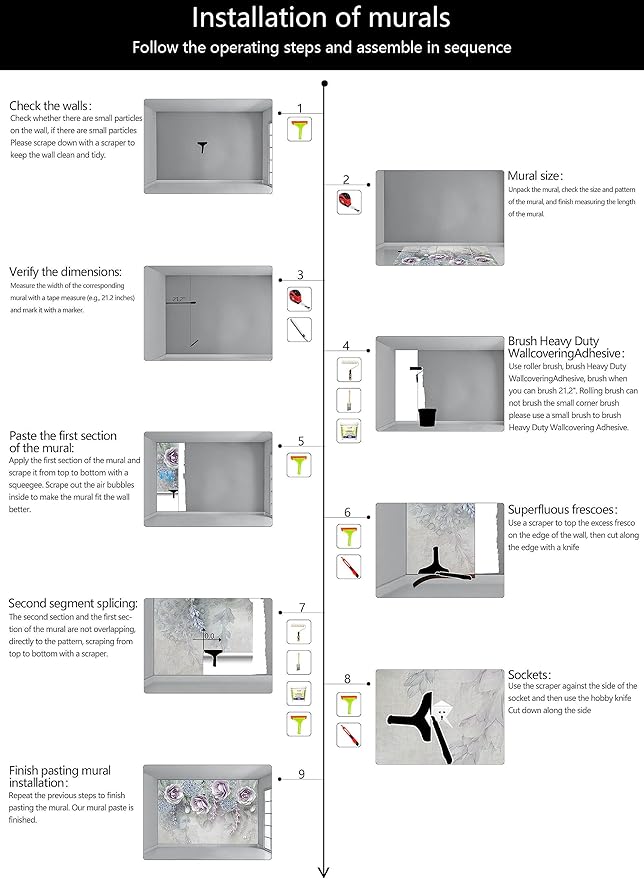 - Construction Installation: Each part of the mural is marked with a serial number underneath, no overlap, direct docking, in order. (Please refer to installation instructions)