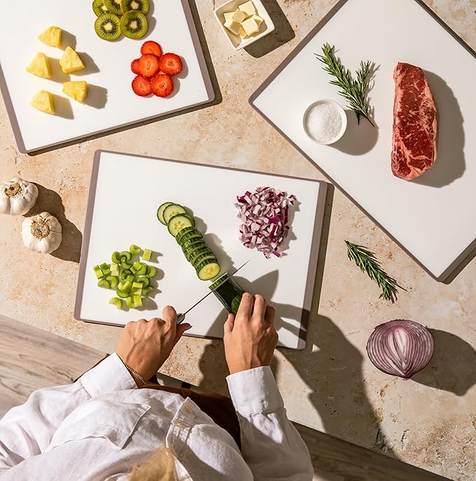 - 3-Pack with Holder: This cutting board set includes small, medium, and large cutting board sizes for every prep need. It also comes with a compact holder that neatly organizes all boards vertically, keeping your countertops clutter-free while ready for any chopping task.