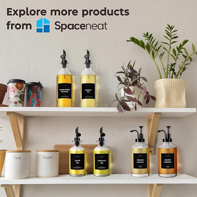 - Includes 55 Sticker Labels — Customize your glass oil dispenser thanks to the complimentary 55 waterproof and oil proof sticker labels made from PVC. Each label is minimalistic and clearly shows the contents of the bottle for convenience and decor.