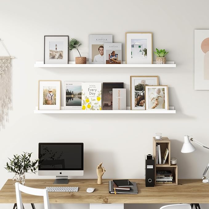 Picture Ledge Shelf for Wall, 48 inch Solid Pine Wood Nursery Book Shelves 2 Packs, Floating Ledge Shelves for Kids' Room Bedroom Bathroom Living Room Photo Frames Office Nursey Wall Decor, White