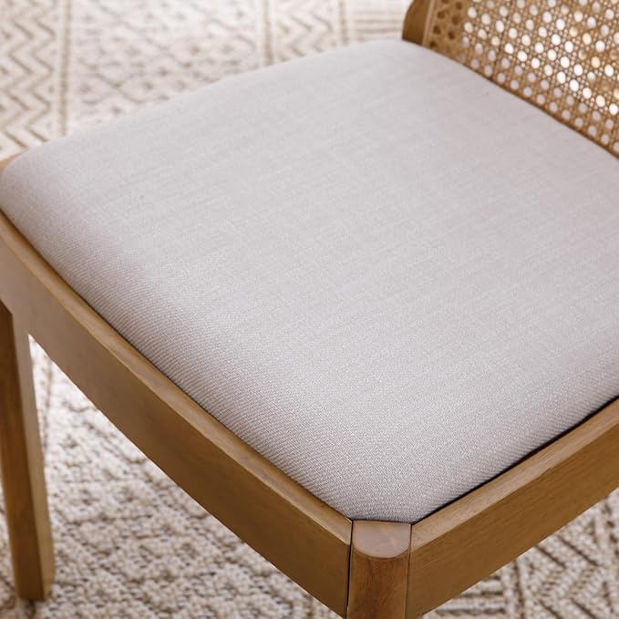 Mid Century Dining Chairs Set of 2, Accent Rattan Linen Fabric Side Chairs Kitchen Chair with Solid Wooden Legs for Living Room Dining Room, Beige