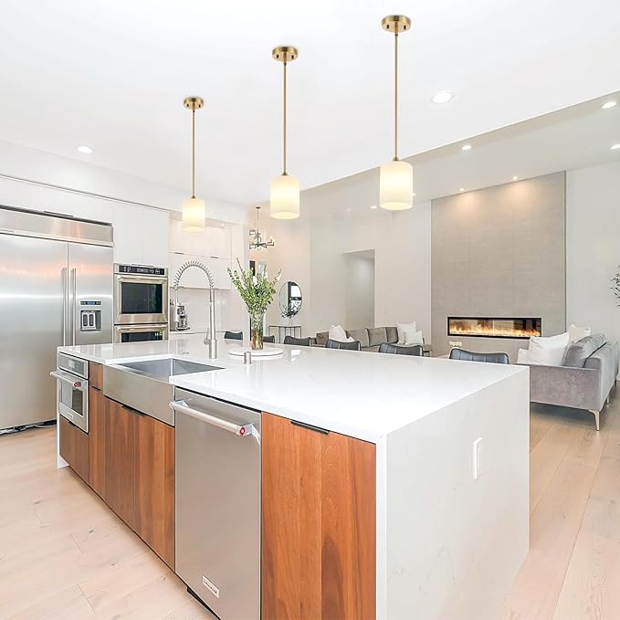 Modern Gold Pendant Light 3 Pack Brushed Brass Mid Century Chandelier White Cylinder Glass Shades Adjustable Rods Farmhouse Ceiling Hanging Lighting Fixture Kitchen Island Dining Room Bedroom