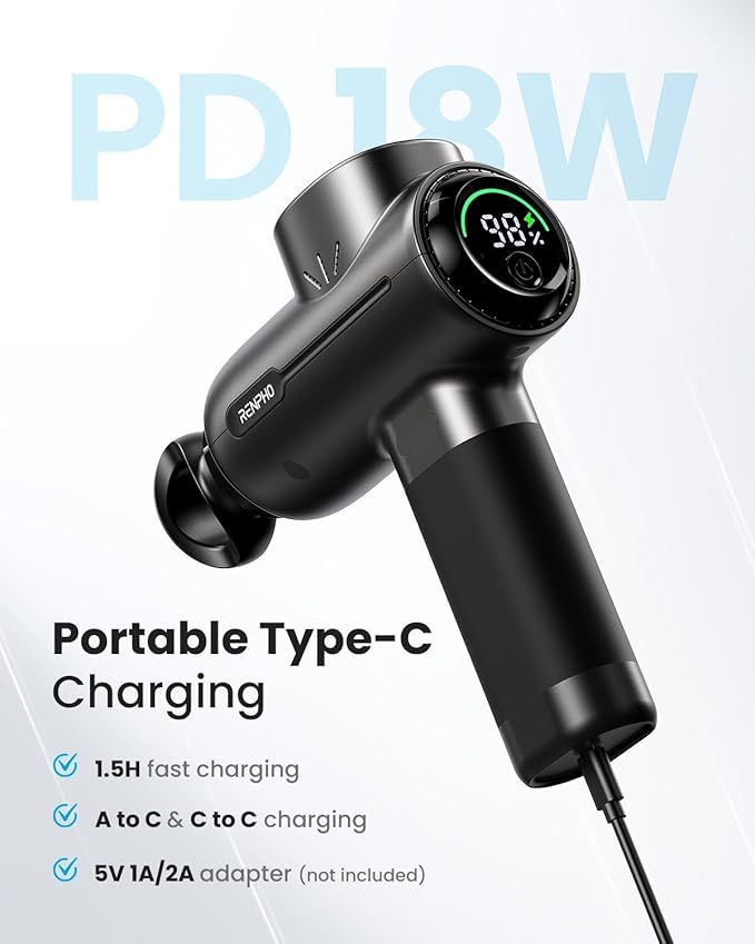 - 1.5H Fast Charging: The muscle massage gun supports 18W PD fast charging and A-C & C-C charging. It only takes 1.5 hours to charge fully. A 10-minute auto-off function is preset for safety. You can turn it on again based on your needs