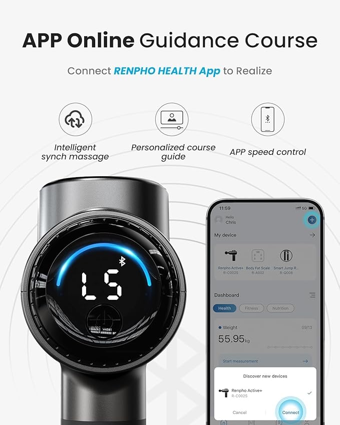 - Smart Massage Gun: Connect to the RENPHO Health App via bluetooth, you can control massagers' speed through the App. Professional video courses from the App provide a visual guide for specific muscle groups to warm up or post workout recovery