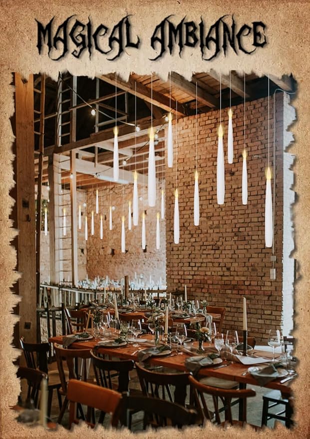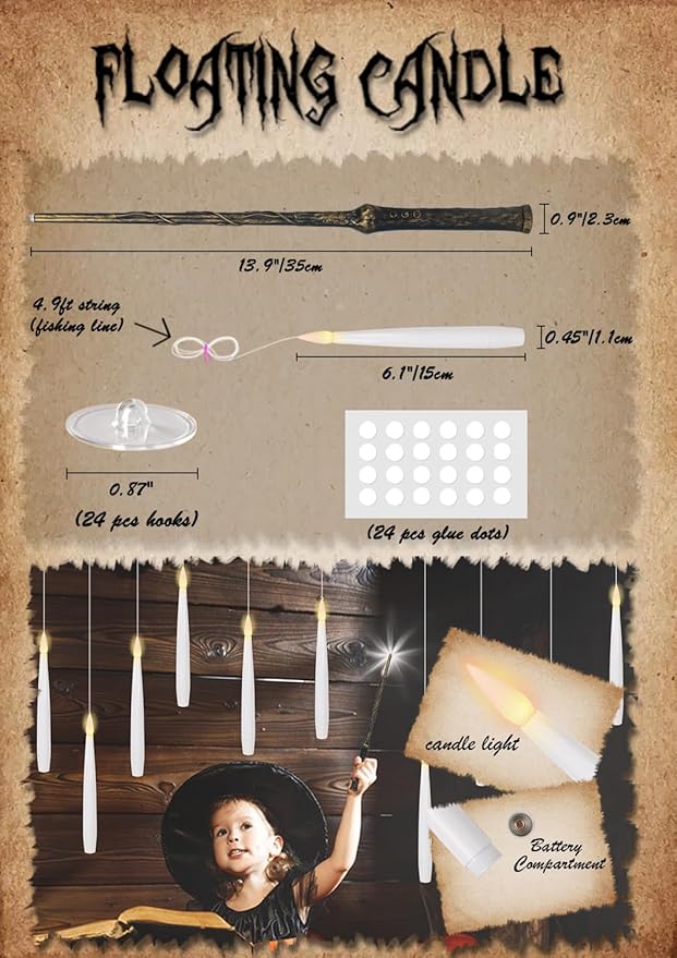 - Package Set: You will receive 22 packs of 6.1 inches tall and 0.45-inch diameter flameless floating candles with 4.9ft fishing line(barely visible) pre-attached to these LED taper candles ready to hang, 1 magical wand remote. Each floating candle is operated by 1 AAA battery (not included).
