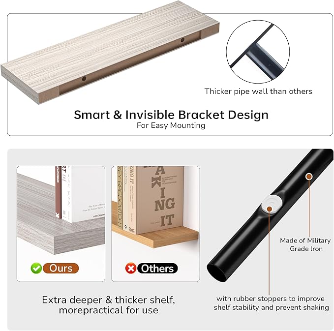 - Easy To Assemble - This floating shelves come with stainless-steel galvanized invisible brackets, toggle bolts for drywall & a simple instruction manual to help you install. The assembly of this wall shelf is very simple, only two boards and some necessary screws and other hardware, and we also have detailed instructions for you to view, you can assemble quickly. Please contact our product support team when you have any questions.