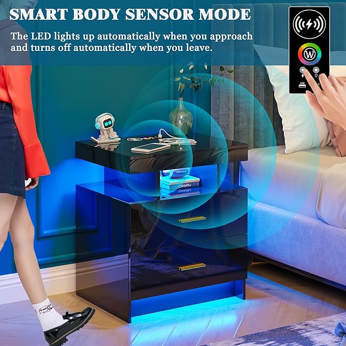 Night Stand with Light, High Gloss Nightstand with USB/Wireless Charging Station, LED Black Nightstands with Storage Drawers, RGB Side End Table for Bedroom Furniture(Black)