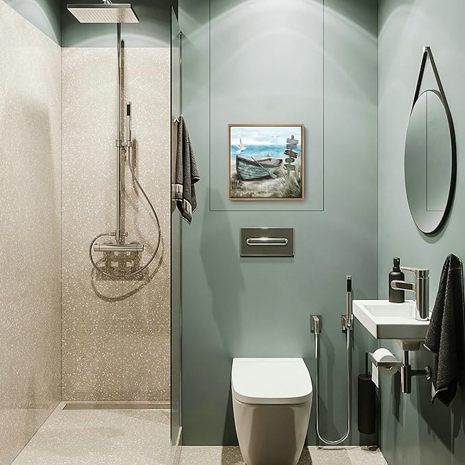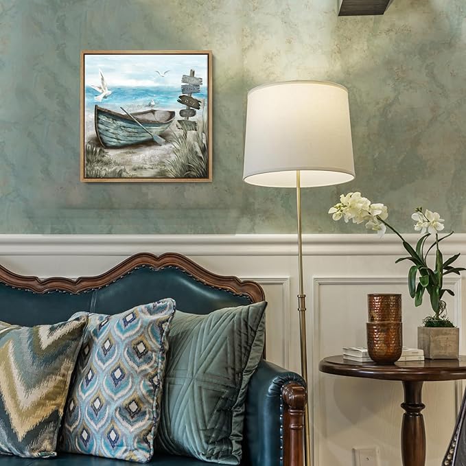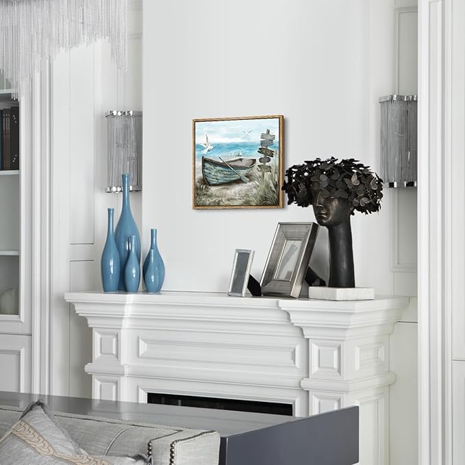 - Calming Seashore Aesthetic: This serene coastal themed canvas wall art captures sea bird resting on the rowboat. Behind the boat is blue ocean with the soaring seagulls. The nautical palette of blues, sand beige, tan, and fluffy white clouds provide a soothing feel. Hang this beach wall art up for a calming vibe, and escape to the beach each day after work in the comfort of your home.