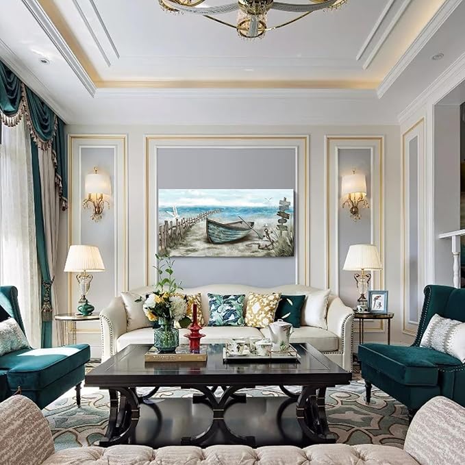 - Calming Seashore Aesthetic: This serene large coastal decor wall art captures sea bird resting on the rowboat. Behind the boat is blue ocean with the soaring seagulls. The nautical palette of blues, sand beige, tan, and fluffy white clouds provide a soothing feel. Hang this beach themed wall art up for a calming vibe, and escape to the beach each day after work in the comfort of your home.