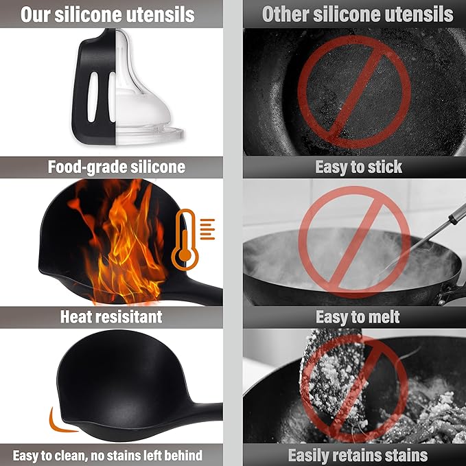 - HEAT RESISTANT, GREAT FOR NON-STICK PANS: Our utensil sets can handle temps up to 446°F without melting. The soft silicone won't scratch non-stick surfaces. The handles are firmly attached. They're durable, making cooking easier and helping your cookware last longer