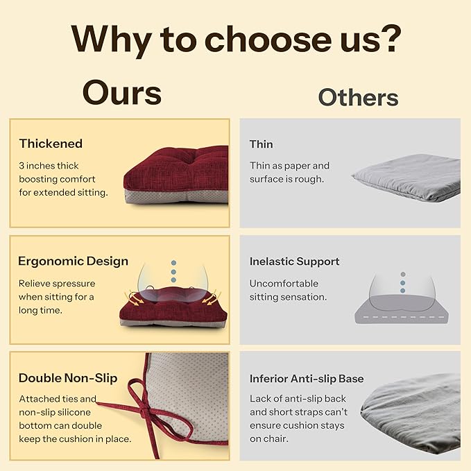- Enhanced Support & Premium Filling: Our dining room chair cushions offer double the comfort with high quality cotton filling that offers superior comfort and support, relieving pressure on your hips and tailbone during extended seating. The chair cushions are tufted to prevent foam clumping. Perfect for extended sitting whether at the desk or dining table it combines comfort with ergonomic support.
